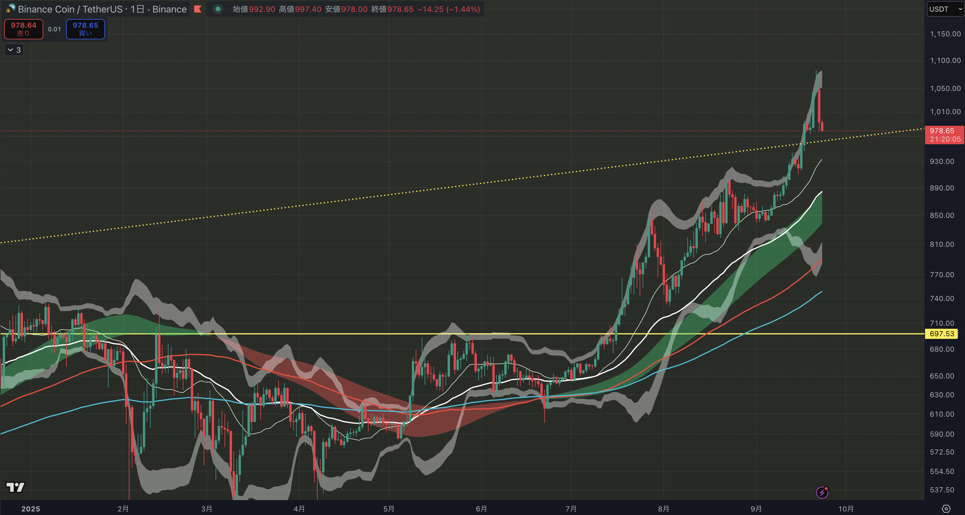 BNBは史上最高値を更新し、真空地帯を駆け抜ける強気の展開を見せました。しかし今は、市場全体の調整に影響される形で戻りを試す場面です。ローリバーサルが成立するかどうかが、次の大相場の分岐点になるでしょう。