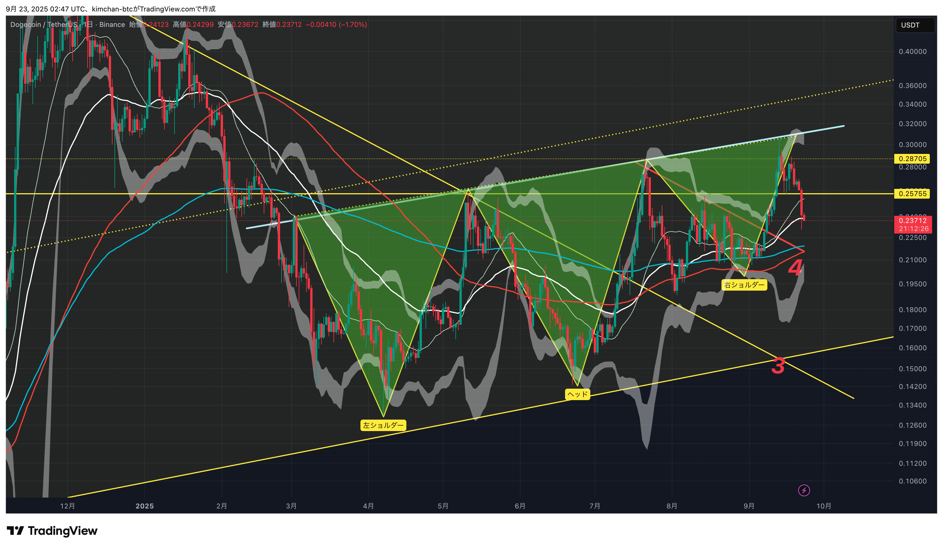 DOGEは一度、4番トレンドラインを抜けて大きく上昇しました。しかし、その後に形成していた逆三尊パターンのネックラインで弾かれ、現在は「逆三尊否定」の値動きをしています。
