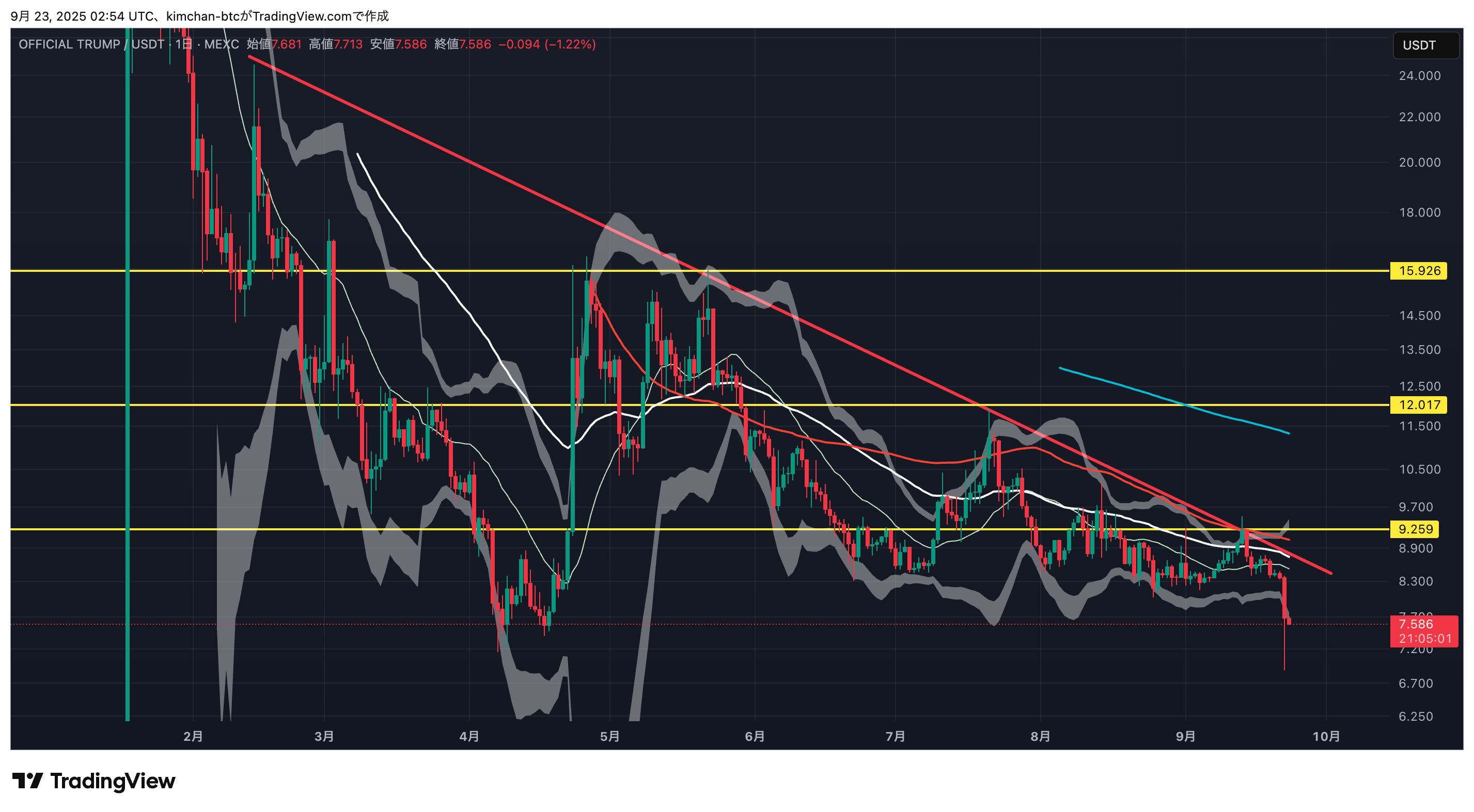 TRUMPコインは下落トレンドが続き、直近のサポートすら割り込む厳しい局面です。初心者の方には決しておすすめできませんし、すでに参入している人も苦しい思いをしているでしょう。
