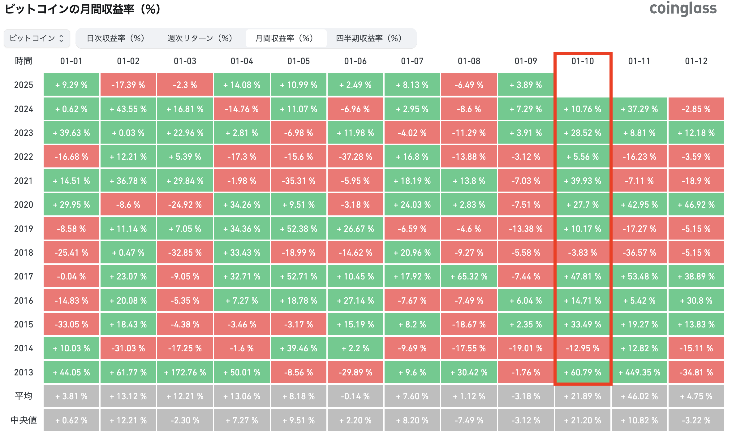 2013年以降、ビットコインは12回のうち10回で10月に上昇。2017年と2021年の強気相場では、それぞれ48%、40%もの上昇を見せました。市場ではこの季節性を「Uptober」と呼んでいます。