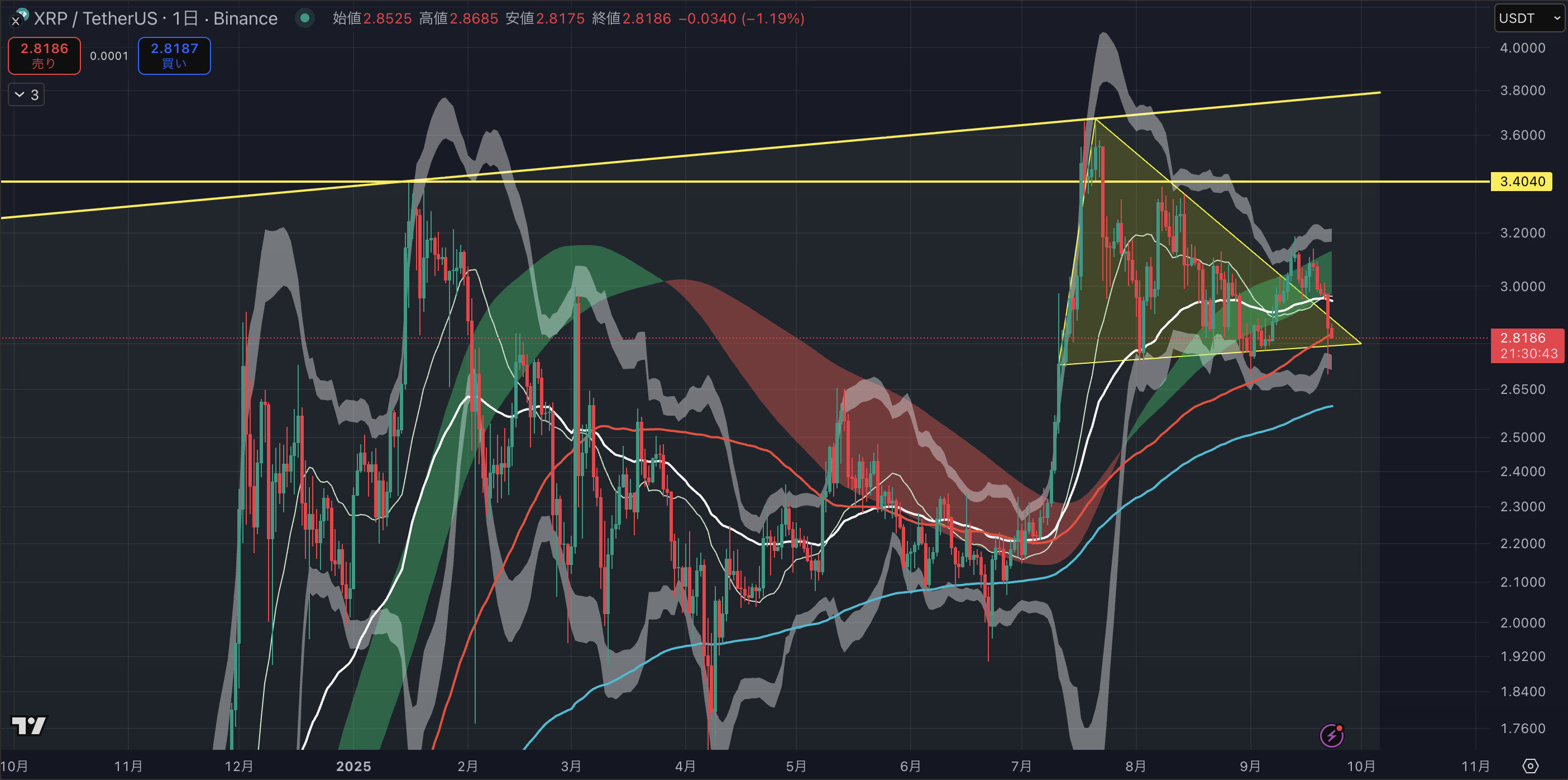 XRPは日足ベースで三角持ち合いを一度は上抜けに成功しました。しかし、その後の値動きは力強さを欠き、再び押し戻される展開となりました。7月中旬には長期チャネル上限(黄色のレジスタンスライン)で跳ね返され、それ以降は方向感に乏しい「パッとしない値動き」が続いています。