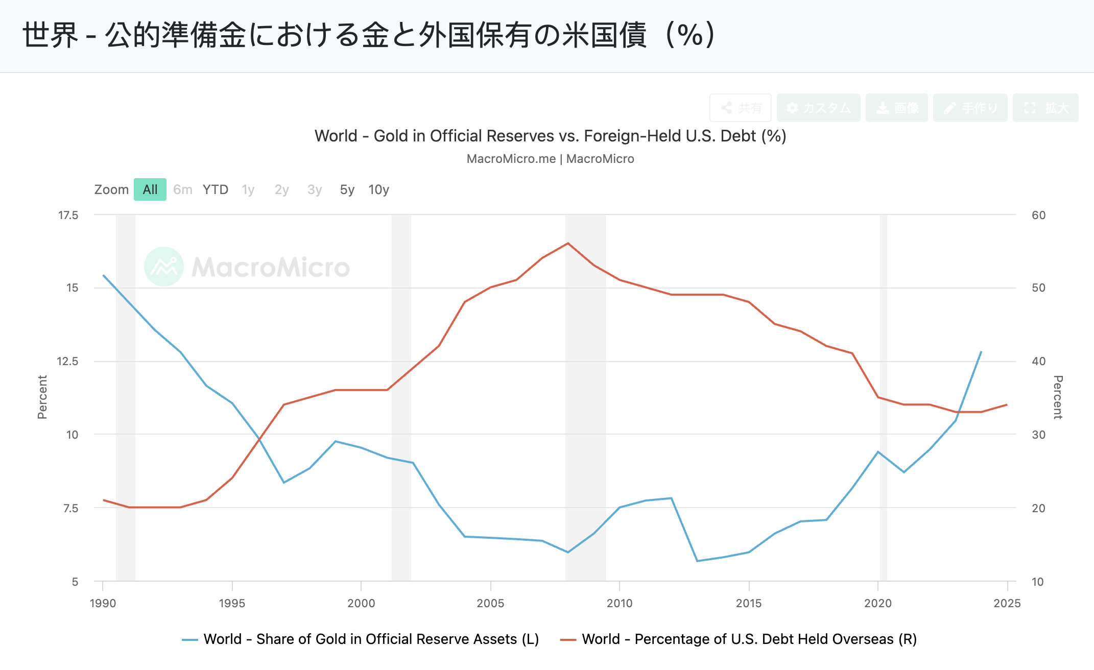直近25年間の流れを見ると、米国債は40%以上減少したのに対し、金の準備は倍増。これは単なるトレンドではなく「時代の逆転現象」です。