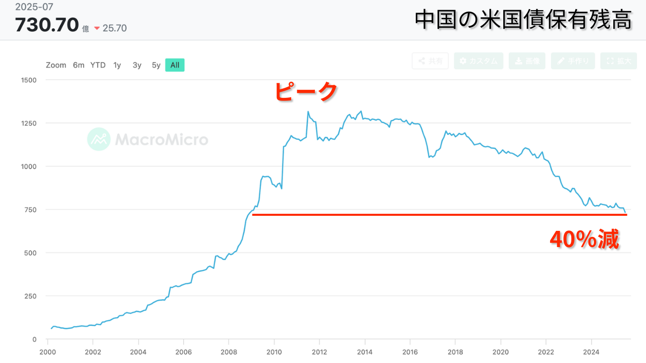 この約16年間、中国は一貫して米国債を売却し続けており、ピーク時から見ればすでに40%近くを手放した計算になります。