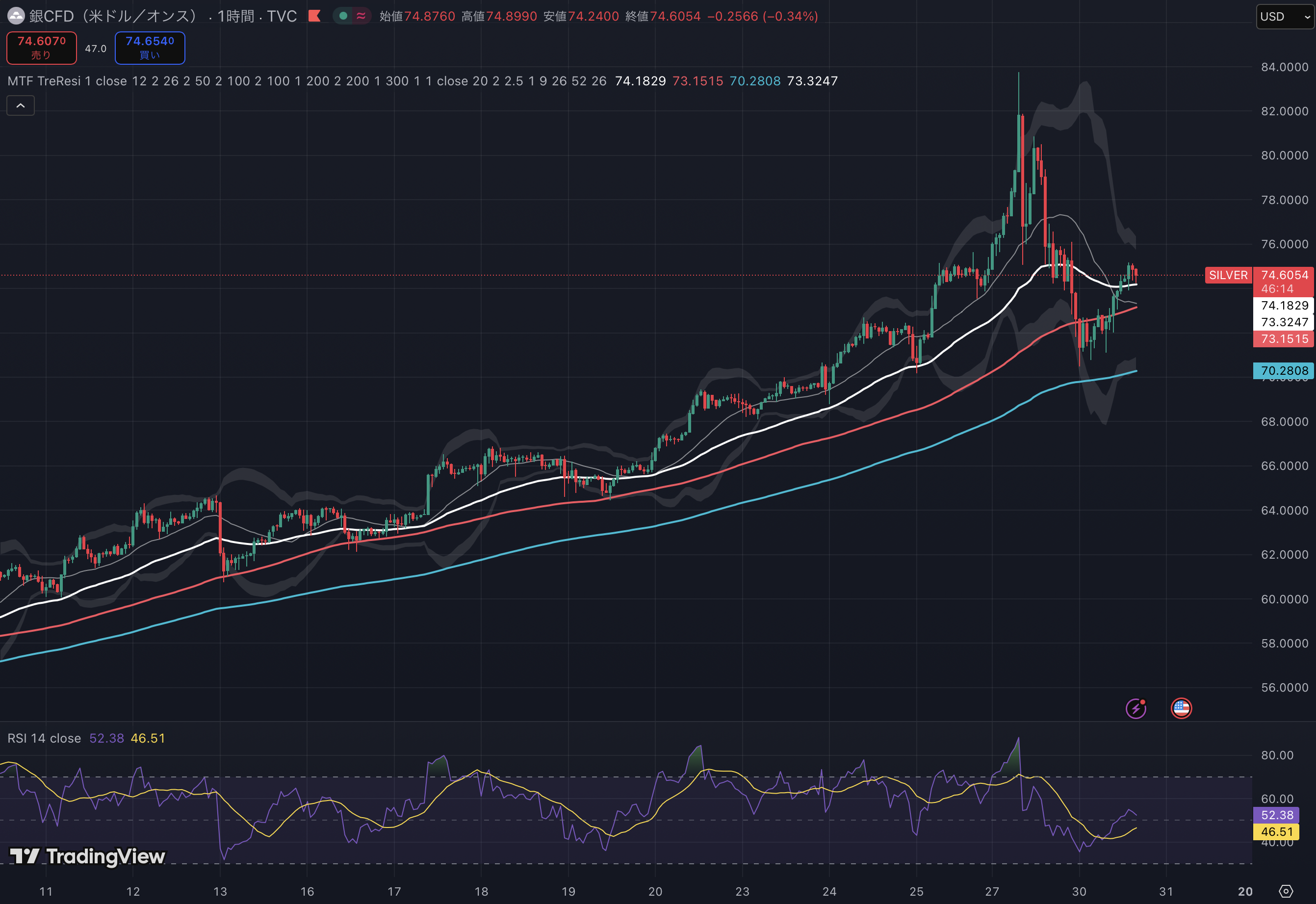 12月29日に83ドルから70ドルへ急落(8.7%下落)した銀価格は、12月30日に74ドル台まで回復しました。